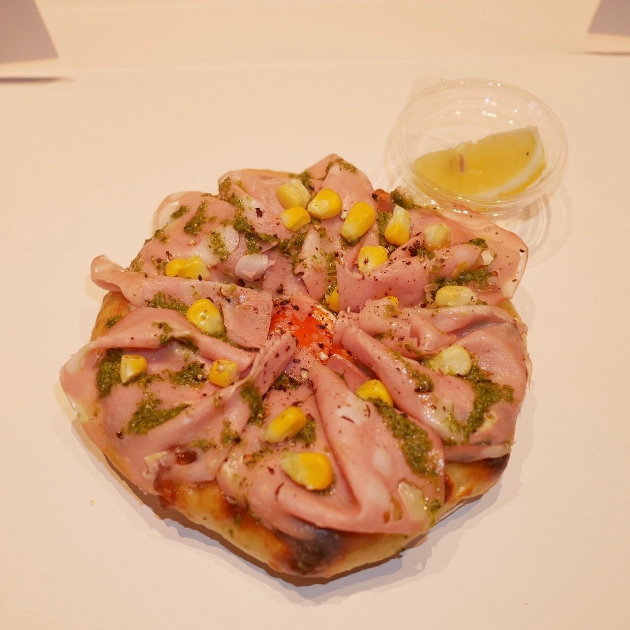 蕗のとうとシーチキンのコクあるソースに、チーズとボローニャソーセージ、コーンの甘みを重ねました。