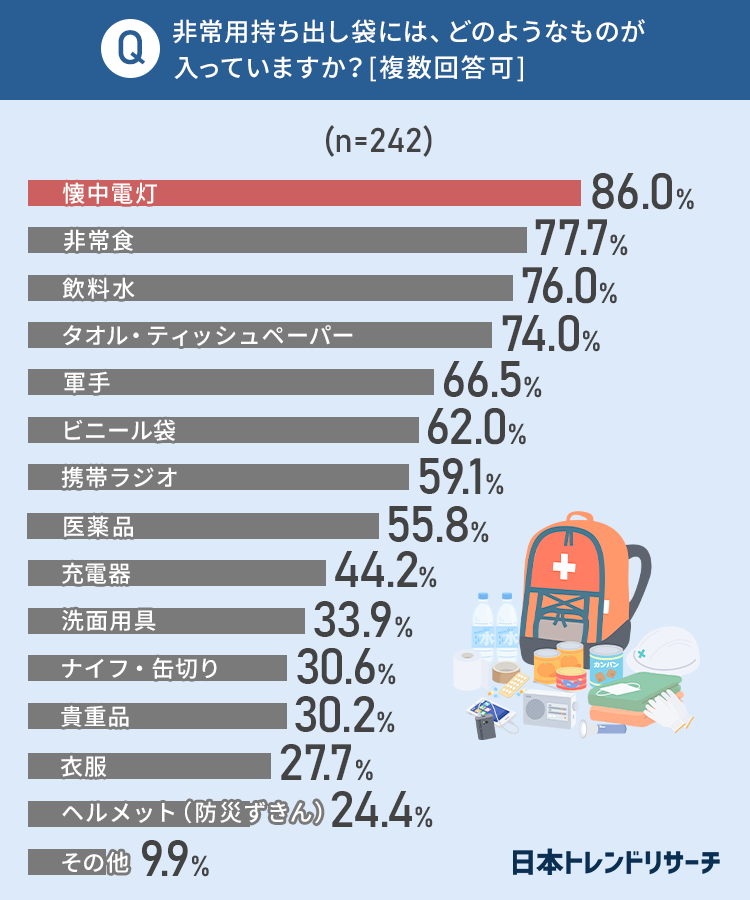 先ほどの質問で「非常用持ち出し袋の準備」をしていると回答した方に、どのようなものが入っているのか聞きました。