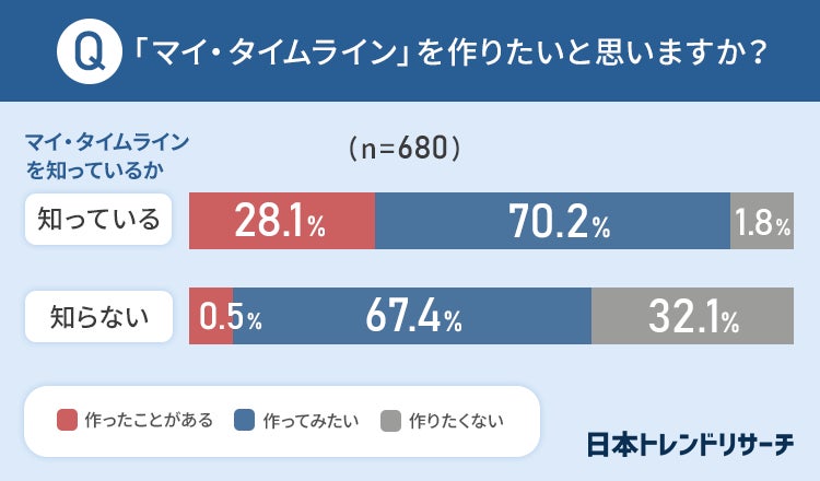マイ・タイムラインを知っているかどうかについての回答を、マイ・タイムラインを作ってみたいかどうかの回答別に集計しました。