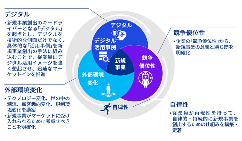 このような状況を受け、KPMGコンサルティングは、デジタルを活用した新規事業の創出・自走化に向けて、3つの要素(デジタル、競争優位性、外部環境変化)の理解促進を図ることで、従業員が「自律的・持続的」に、新規事業創出が可能となる仕組みの構築・定着を目指す、新規事業の創出・自走化支援サービスの提供を開始しました。