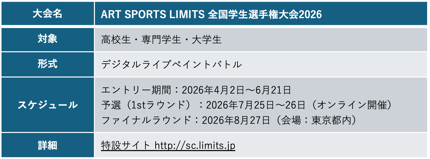 『ART SPORTS LIMITS 全国学生選手権大会2026』エントリー開始。