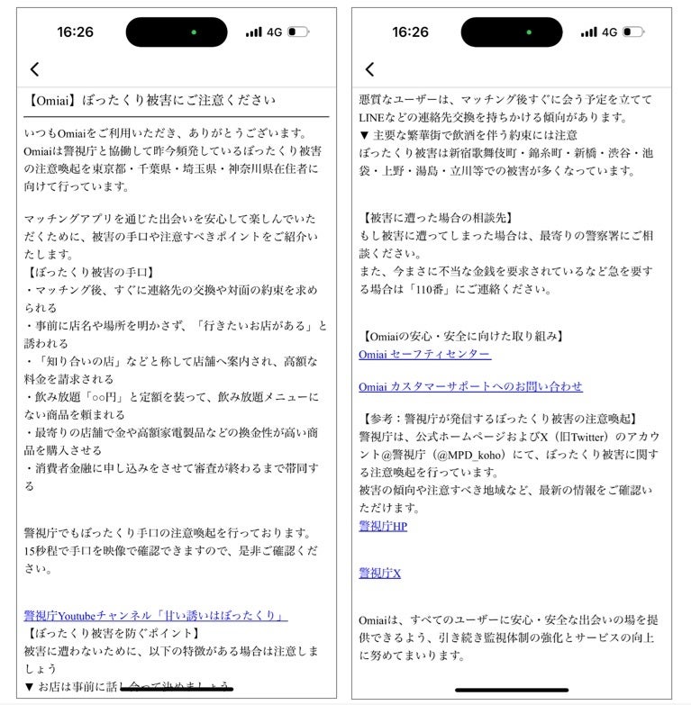 このたび、これらの取り組みの一環として、エニトグループと警視庁が連携して「with」[Omiai」ユーザーを対象にぼったくり被害における詐欺の手口や対策をアプリ内お知らせやプッシュ通知、メール配信などで紹介する啓発活動の実施に至りました。