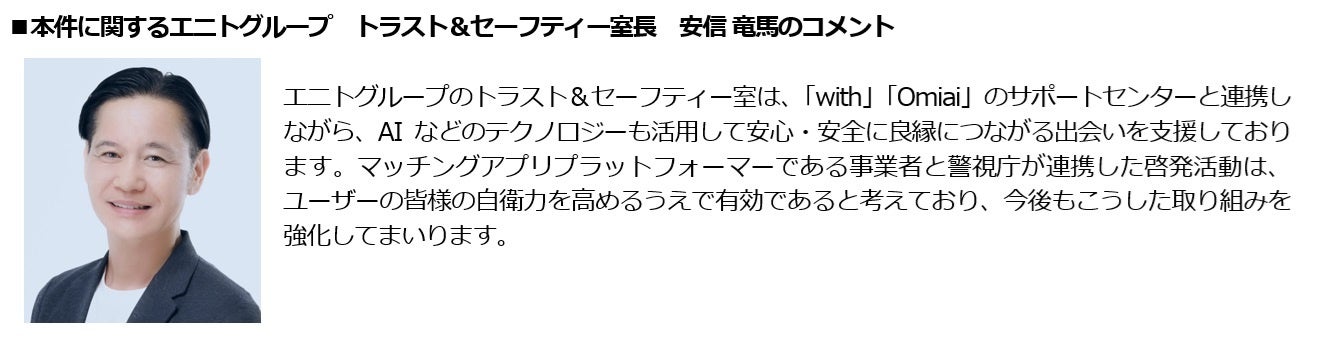 エニトグループのトラスト&セーフティー室は、「with」「Omiai」のサポートセンターと連携しながら、AIなどのテクノロジーも活用して安心・安全に良縁につながる出会いを支援しております。マッチングアプリプラットフォーマーである事業者と警視庁が連携した啓発活動は、ユーザーの皆様の自衛力を高めるうえで有効であると考えており、今後もこうした取り組みを強化してまいります。