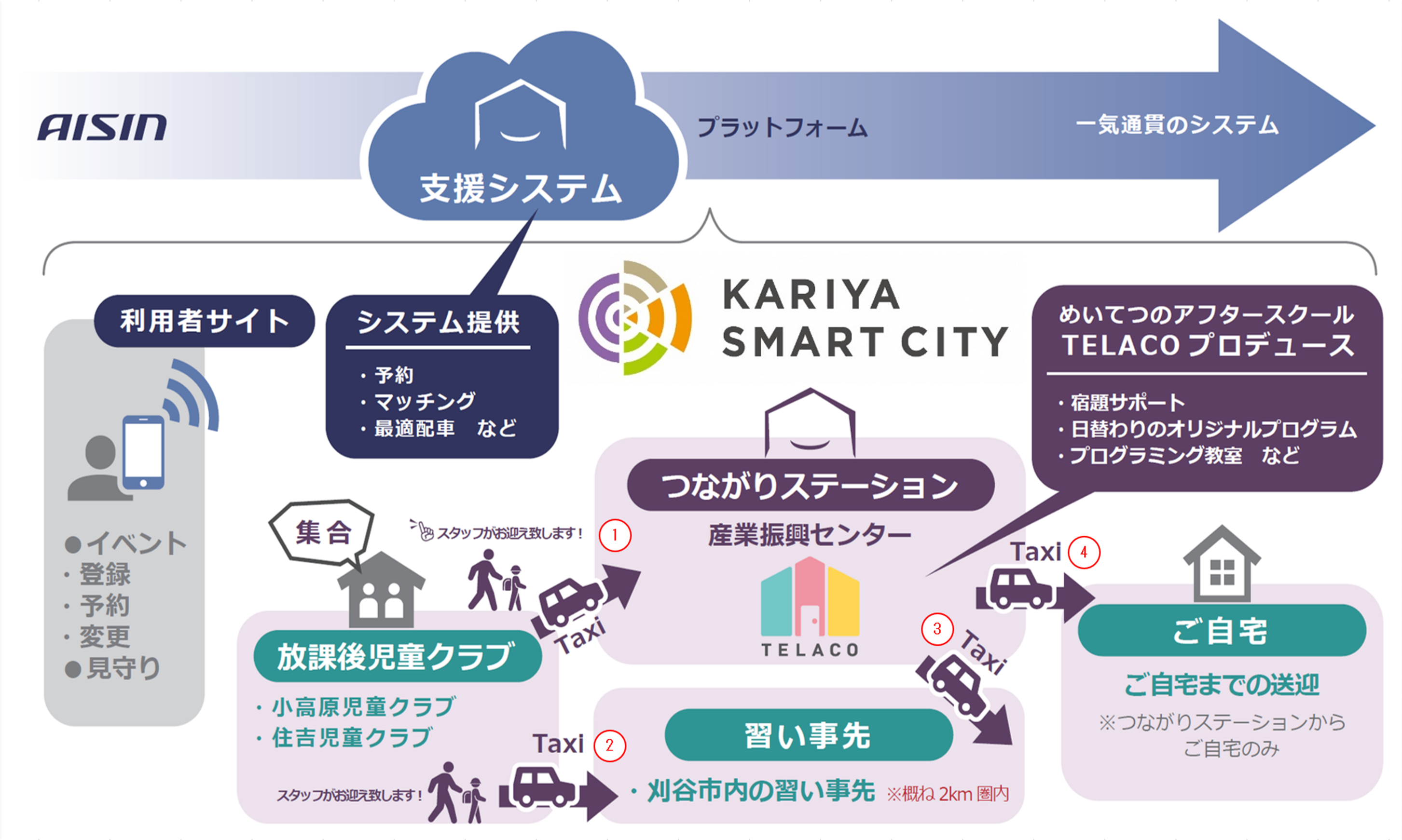 同社はこれまでアフタースクール事業TELACO等を運営してきたノウハウを活用することで、本実証実験においてMaaSのハブ拠点となる「つながりステーション」にて刈谷市の小高原児童クラブおよび住吉児童クラブのお子さまを対象に、付加価値の高い教育プログラムを提供する役割を担います。