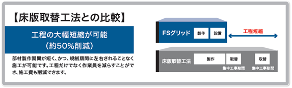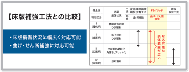 疲労以外の損傷(塩害や凍害など)により,将来的に取替えなければならない鉄筋コンクリート床版においても,『FSグリッド』で延命することにより,床版取替え工事の施工時期を調整することができ,工事の平準化を図ることが可能となる。