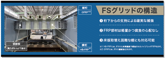 『FSグリッド』は, 鉄筋コンクリート床版の曲げ補強(※3)と,せん断補強(※4)効果が期待できます。繊維シート補強では対処できない程度まで劣化が進行した鉄筋コンクリート床版にも使用可能です。