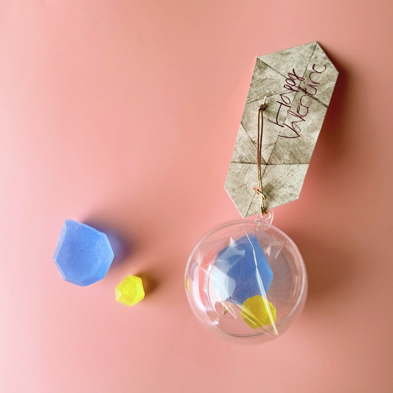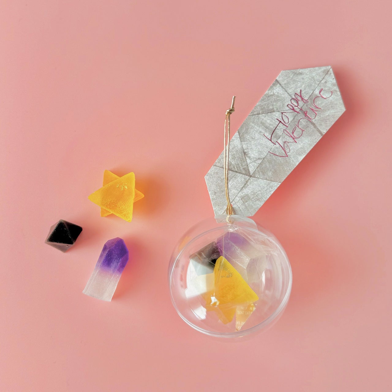 職人が小刀で宝石や鉱物のように切り出す琥珀糖「こうぶつヲカシ」。カラフルなこうぶつヲカシを3つの透明なカプセルに詰め、「Happy Valentine」のメッセージを添えてご用意しました。宝石のようなビジュアルと、ころんと可愛いカプセルデザインは、友達同士で贈り合うバレンタインギフトはもちろん、職場や学校での配り用スイーツとしてもおすすめ。「チョコレート以外のバレンタインギフトを探している」という方にもぴったりの一品です。