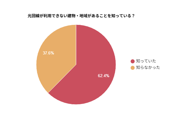 光回線は回線事業者によって提供エリアが異なりますが、この点を知っていた方は62.4%で、多くの方が提供エリアについて理解していることが明らかになりました。一方で、37.6%の方は利用できない場所があることを知らなかったと回答しました。