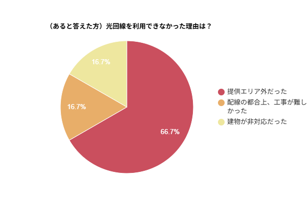 光回線が使えなかった理由は、「提供エリア外」(66.7%)が最も多い回答となりました。その他「配線の都合上工事が難しかった」(16.7%)「建物が非対応だった」(16.7%)という回答もあり、物理的・地域的な制約が大きな課題であることがうかがえます。