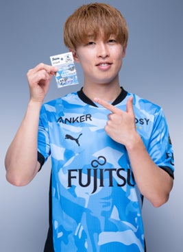 ・クラブオフィシャルグッズ「KKOOR(くくーる)」を手に紹介する川崎フロンターレ選手