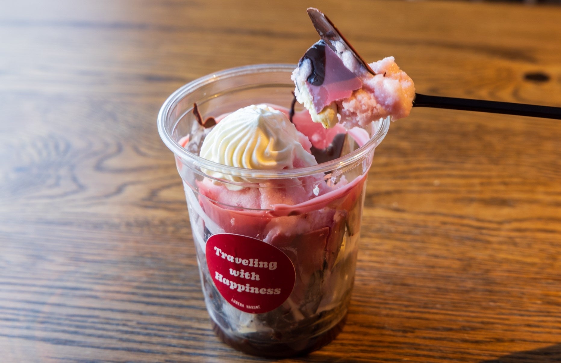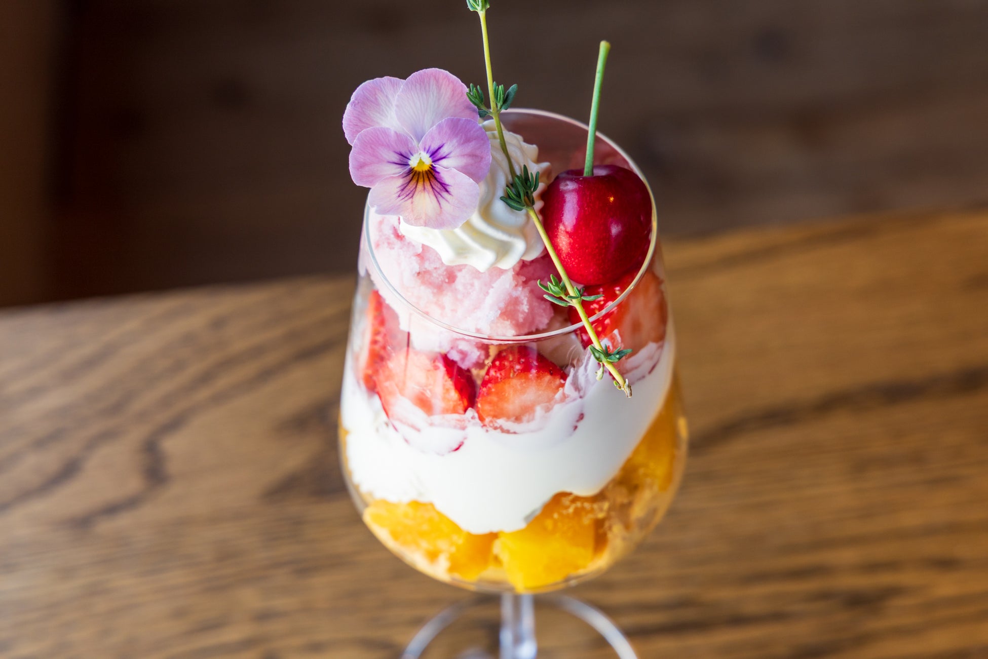 ホワイトオーチャーのゼリーにキャラメルムース、オレンジ、チョコクッキーを重ね、バニラ&イチゴアイス、旬のフルーツをトッピング。ローストココナッツやエディブルフラワーで彩った、華やかな4周年限定パフェです。