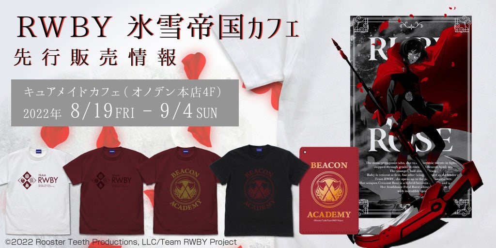 また、「RWBY 氷雪帝国 ルビー・ローズ Tシャツ」「チームRWBY Tシャツ」「ビーコン・アカデミー Tシャツ」「ビーコン・アカデミー フルカラーパスケース」は、8月19日(金)~9月4日(日)CURE MAID CAFE'(キュアメイドカフェ)[オノデン本店4F ジーストア・アキバ内]で開催の〈『RWBY 氷雪帝国」』カフェ〉にて先行販売予定です。