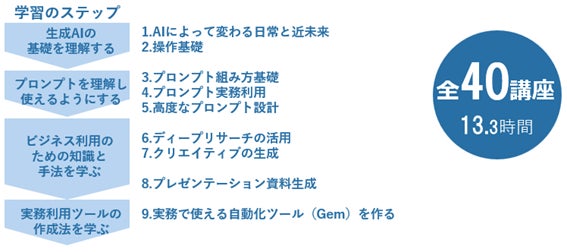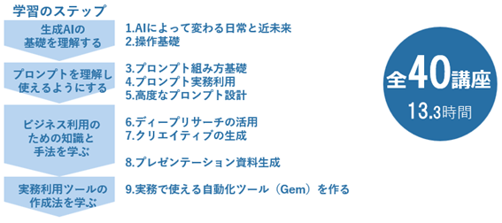 新東通信が掲げる 「AIドリブン宣言」 の具体的アクションとして組成した本プログラムは、企業の全社員が生成AIを実務で活用できる人材へと成長するための、実践的なオンライン学習サービスです。