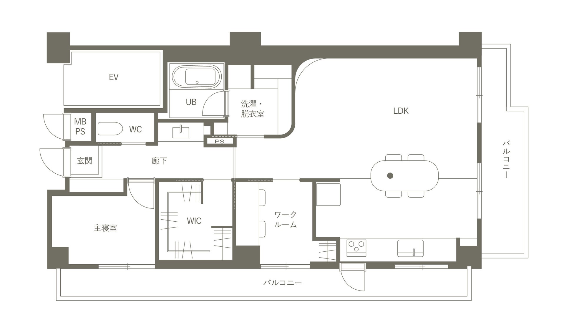 完全オーダーメイドのキッチンは、レンジフードや家電を収納の中にすっきり収める設計。壁付けにすることでLDKの視線が抜け、空間が広く感じられます。さらに家具のように馴染むデザインで、生活感を抑えたミニマルな印象を実現しています。