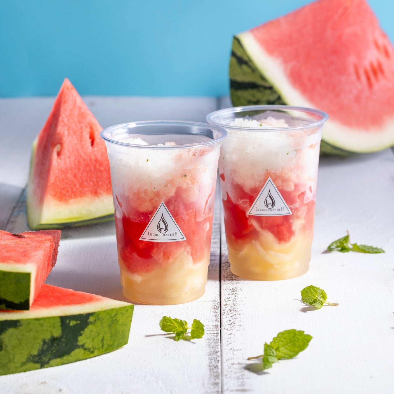LE CHOCOLAT DE Hでは入善ジャンボ西瓜の魅力を味わって頂く為、2種類のスイーツを展開。一つめは入善ジャンボ西瓜をそのまま食べているかのようなスムージーを作りました。