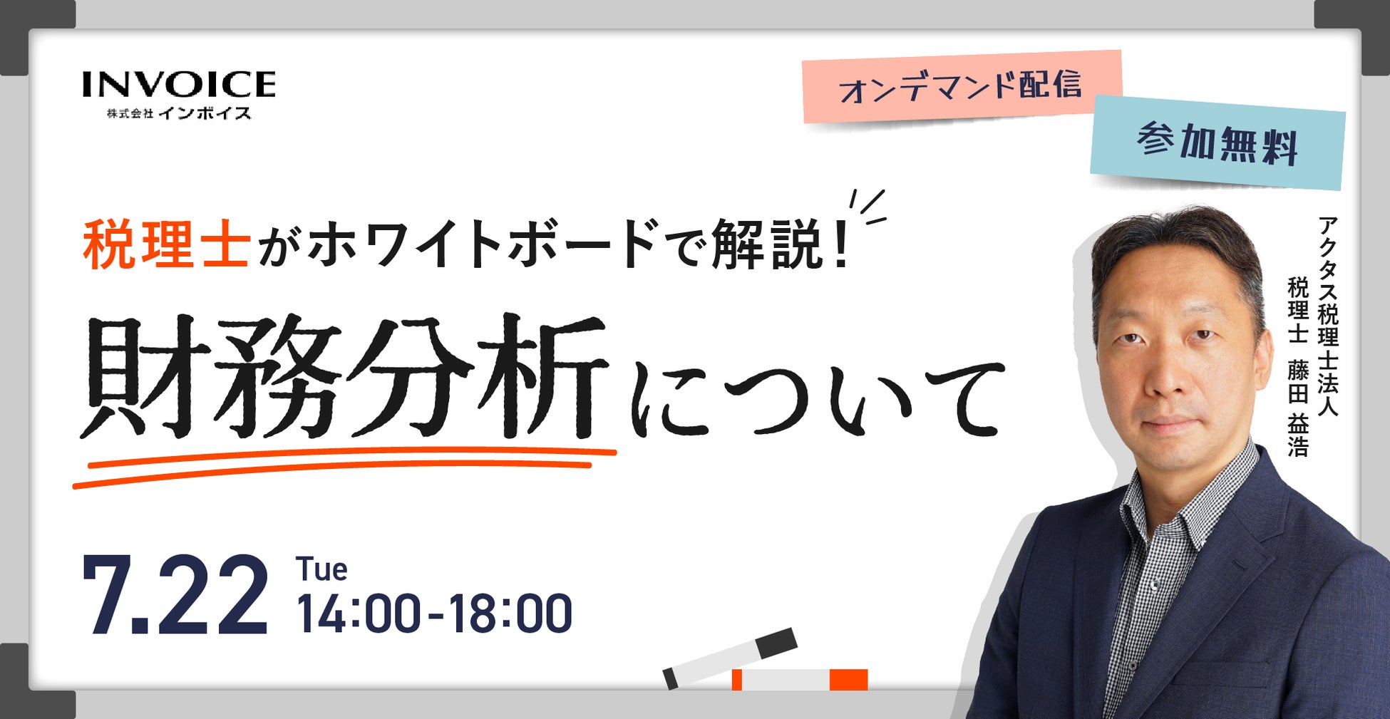 約16,000社に対して通信費や水道光熱費などの一括請求サービス「Gi通信」「OneVoice公共」を提供する、株式会社インボイス(代表取締役:加茂 正巳 本社:東京都千代田区)は、アクタス税理士法人(代表:粕谷 直人 本社:東京都港区)の藤田 益浩氏をお招きし、「税理士がホワイトボードで解説!財務分析について」をオンデマンドセミナー形式で配信することをお知らせ致します。