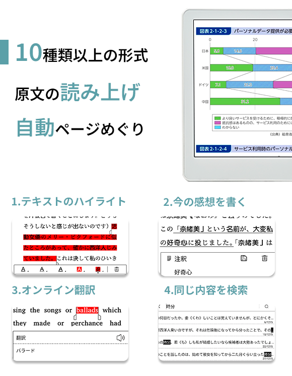 M6CはPDF、EPUB、MOBI、TXTなど10種類以上の形式に対応しており、どんな形式の書籍でもスムーズに読めます。自動で最適化されたレイアウトに加え、手動で横読み・縦読み、文字サイズ、ダブルページなども自由に調節可能です。