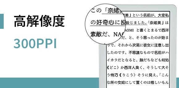白黒表示モードでは、最大300PPI(白黒表示)の高解像度を実現しており、文字を拡大してもギザギザが出ず、テキストを鮮明かつ詳細に表示します。