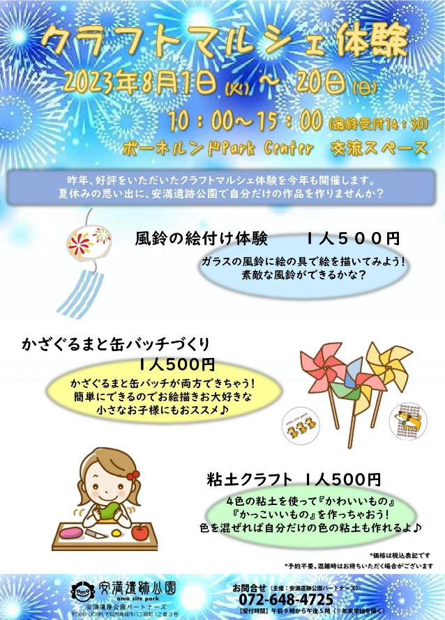 このイベントは、安満遺跡公園を管理する安満遺跡公園パートナーズが「ものづくり」の楽しさを体験してほしいという思いから企画。暑い夏に「涼」を感じられる風鈴やかざぐるまのような夏定番グッズなどを手作りできます。