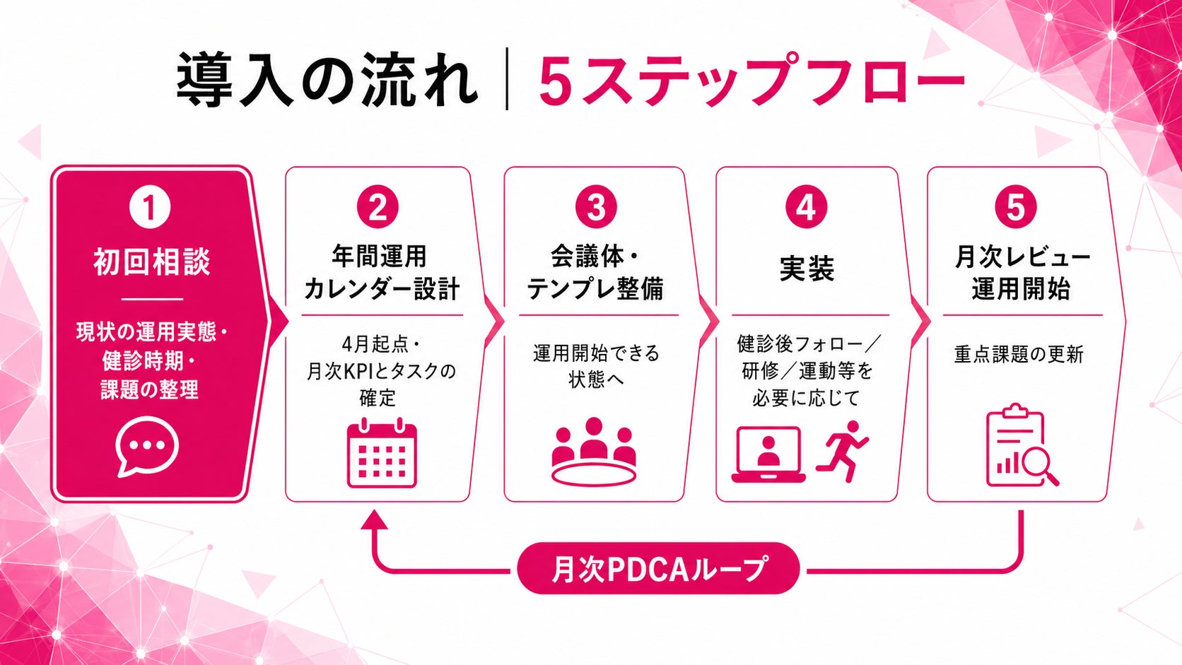 4月:年度方針とKPI確定/会議体立上げ/健診後フォロー設計