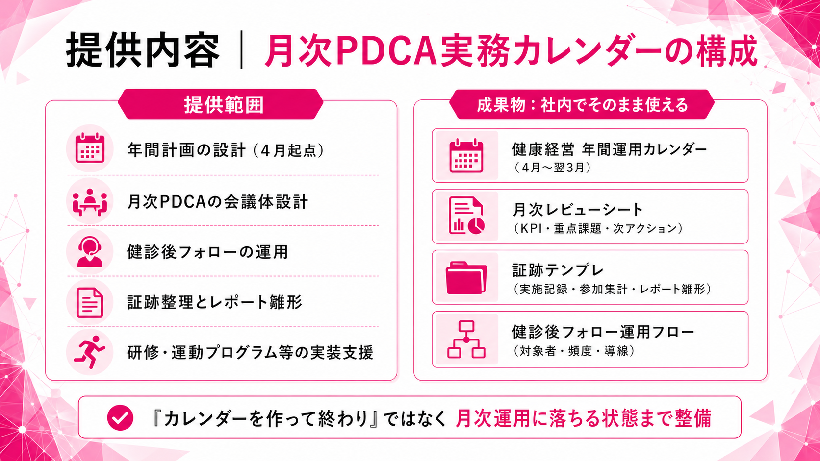 本支援は「カレンダーを作って終わり」ではなく、月次運用に落ちる状態まで整備します。
