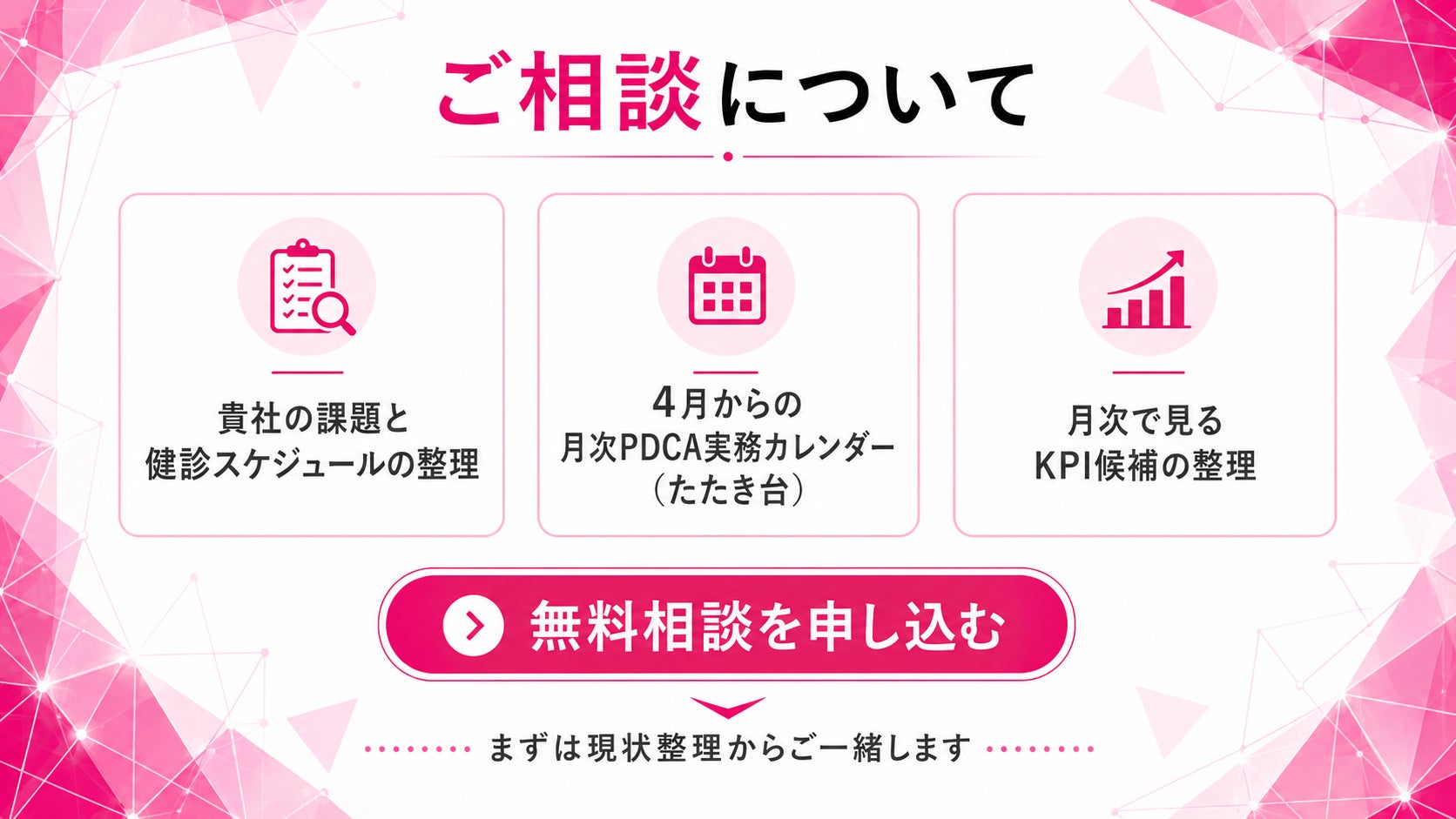 初回相談では、貴社の課題と健診スケジュールを前提に、4月からの月次PDCA実務カレンダー(たたき台)と、月次で見るKPI候補を整理します。