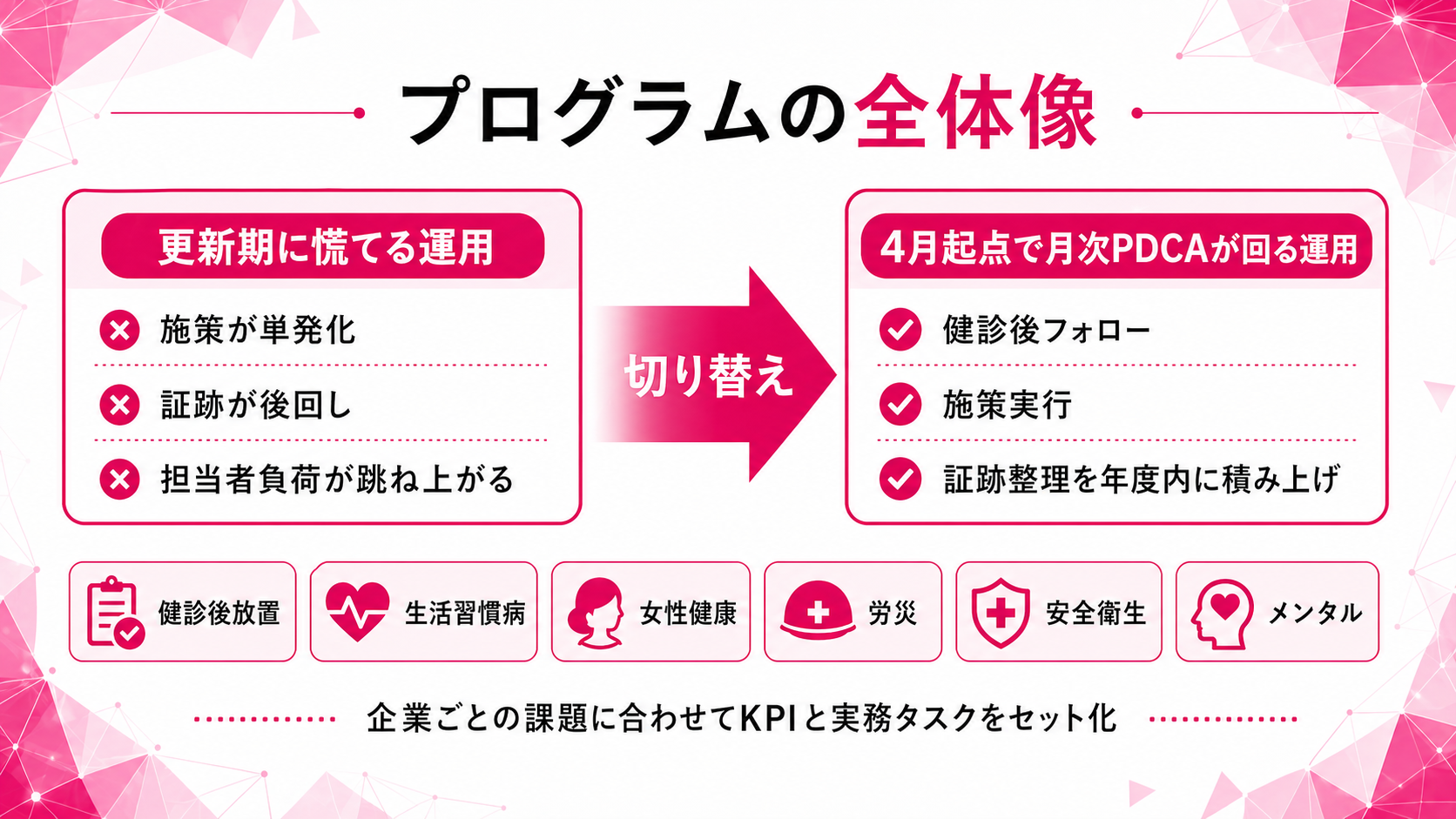 健康経営は施策の実施だけでなく、健診後フォロー、運用会議、証跡整理、改善提案を通年で積み上げることが重要ですが、現場では担当者負荷や優先度の揺れで月次運用が止まりがちです。
