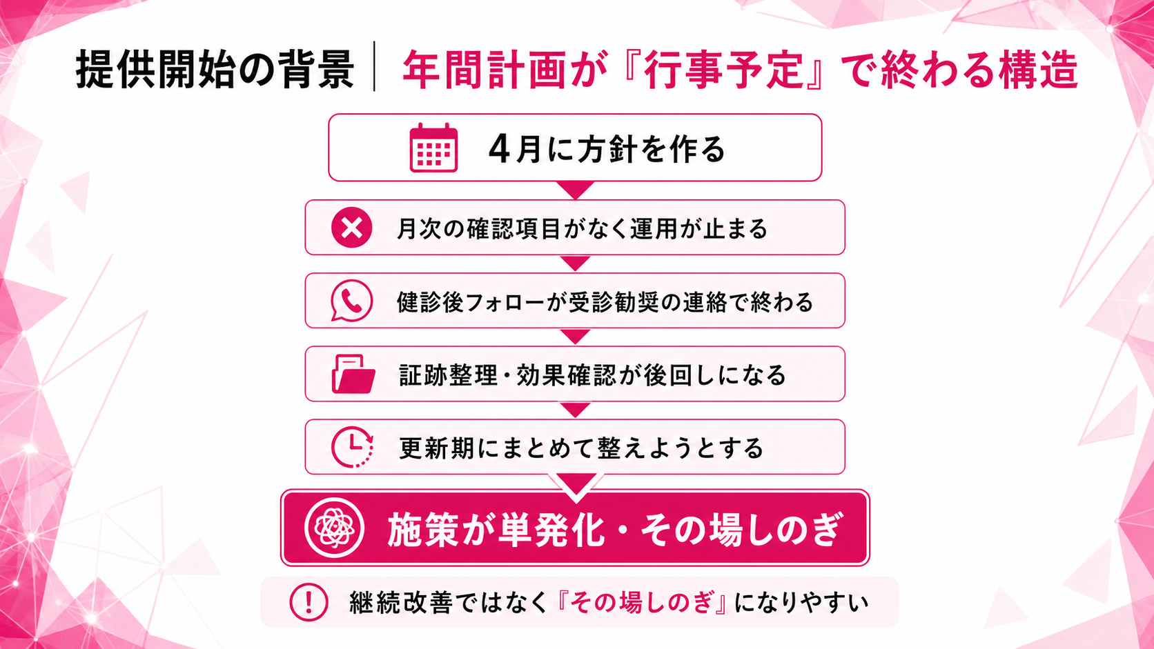 4月に方針を作るが、月次の確認項目がなく運用が止まる