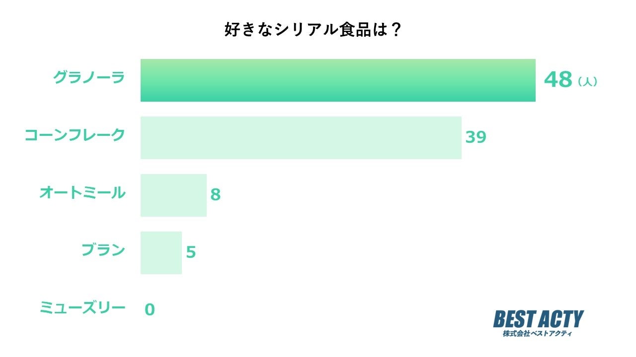 好きなシリアル食品について100人にアンケートを行ったところ、「グラノーラ」と回答する人が最も多い結果となりました。