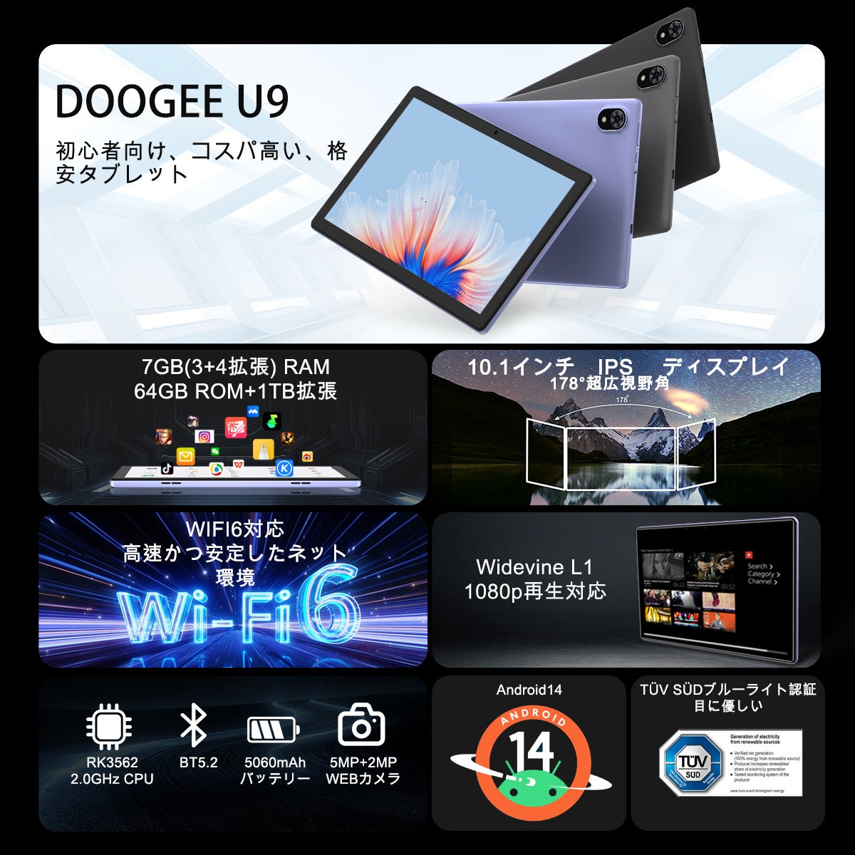 特点:Android14 タブレット RAM 7GB&64GB ROM+1TB拡張 DOOGEE U9 WiFi6 10.1インチタブレット Widevine L1 5G WiFiモデル IPSディスプレイ TÜV低ブルーライト認証 GMS認証済 Androidタブレット まさに初心者向けタブレット