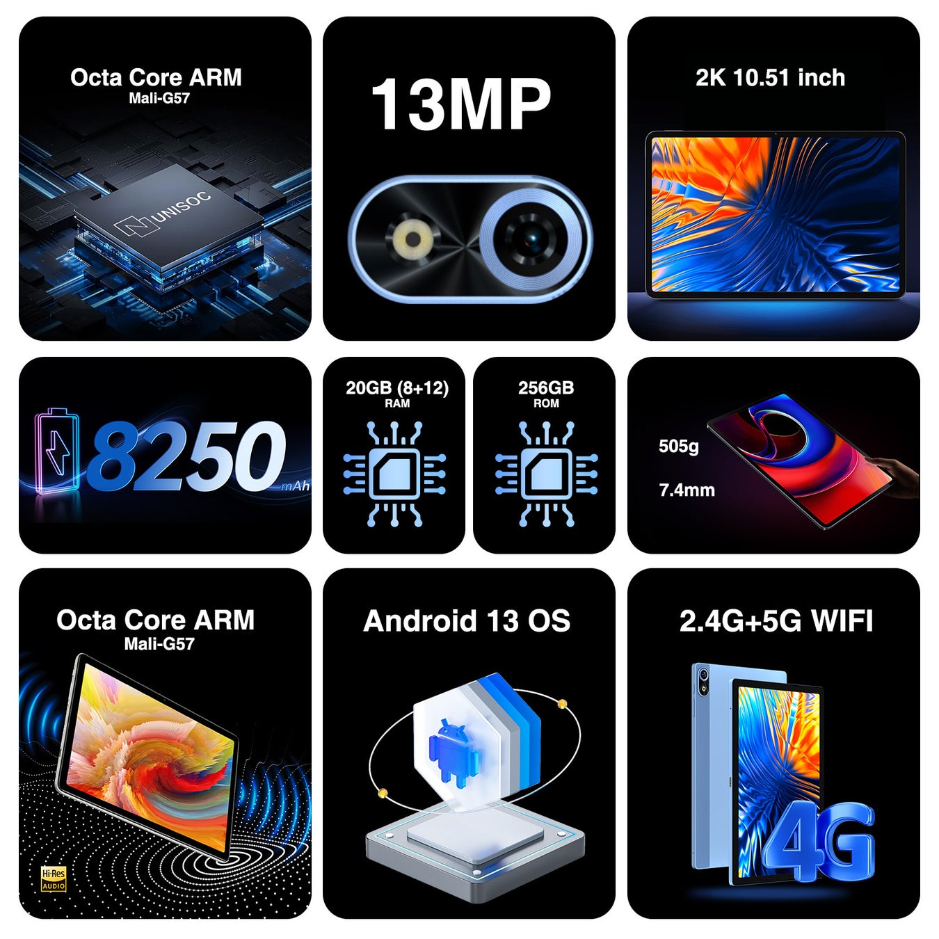 8250mAhの大容量バッテリーを搭載し、長時間の使用にも耐えます。また、13MPリアカメラと8MPフロントカメラで、高品質な写真やビデオ通話が可能です