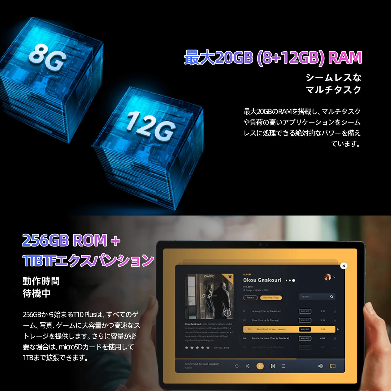 DOOGEE T10 Plusは、20GB RAMと256GBのROMを搭載したAndroid 13タブレットです。さらに、TFカードで最大1TBまでのストレージ拡張が可能で、大容量のデータを余裕で保存できます。超大画面の10.51インチ2K IPSディスプレイは、TÜV低ブルーライト認証を取得しており、目の負担を軽減します
