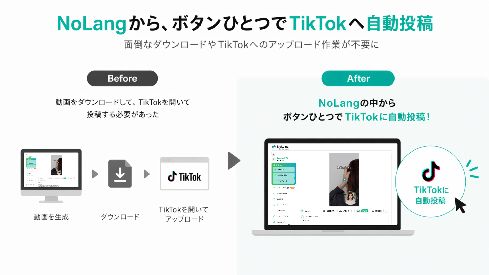 その課題を解決するため、動画生成AI「NoLang」は本日、TikTokへのダイレクト投稿を可能にする「TikTok連携機能」の提供を開始しました。AIによる動画の自動生成から、TikTokへの投稿・公開設定までを1つのプラットフォーム内で完結させることで、制作コストと運用工数の双方を大幅に削減します。動画制作の専門スキルや外注費用をかけられない中小企業や個人事業主でも、TikTokを活用した情報発信やマーケティングに取り組める環境を実現します。
