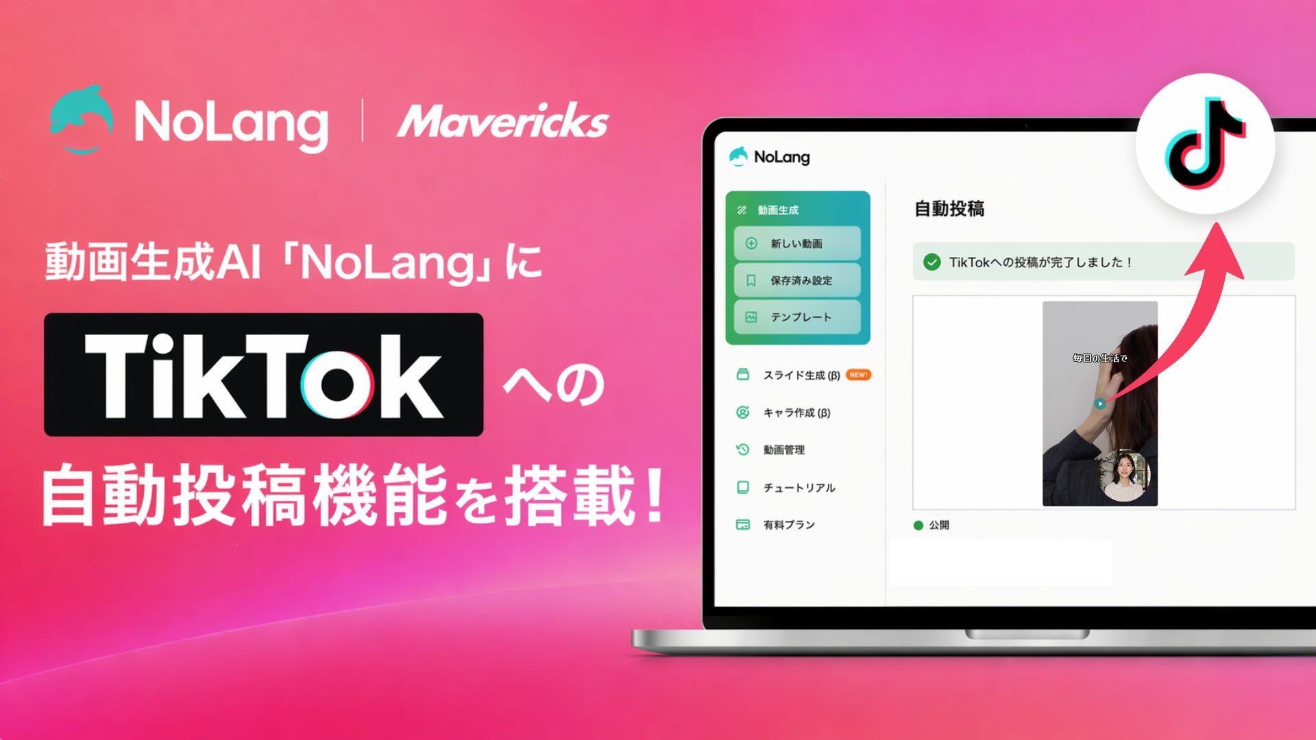 株式会社Mavericksは、動画生成AI「NoLang」にTikTok連携機能を搭載。動画の生成から投稿までをワンストップで完結し、企業のSNS運用工数を大幅削減
