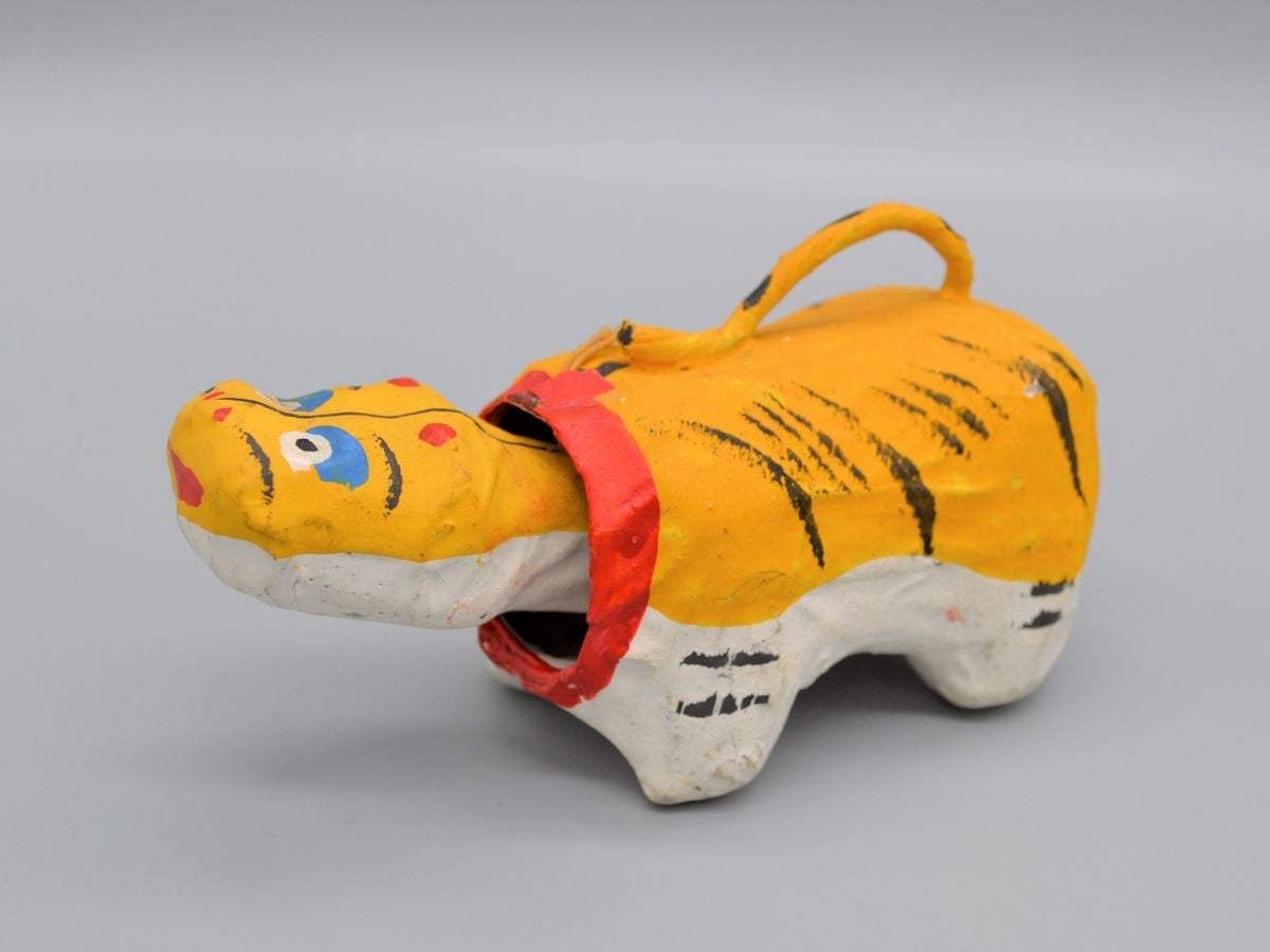 大阪市中央区道修町の少彦名(すくなひこな)神社で11月に開催される神農祭にて魔除けの縁起物として頒布されている張子の神虎です。文政5年(1822)のコレラ大流行の際、「虎頭殺鬼売黄円(ことうさっきうおうえん)」という丸薬を製造し、張子と一緒に授与されたと伝わります。一方、大阪張子の職人である「面清」に残された文書には、明治18年(1885)のコレラ流行に際し製作されたとの異説もみえます。その起源については定かではありませんが、長らく大阪で愛されてきた張子であることは確かです。