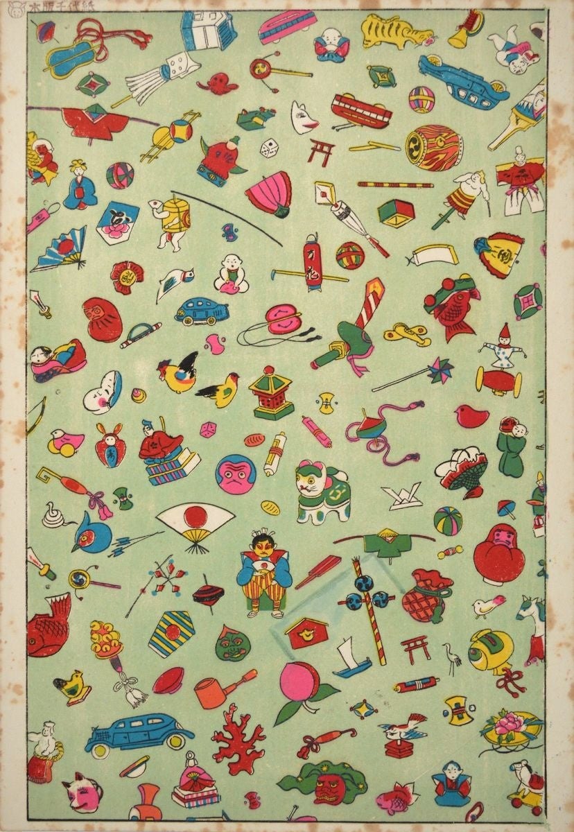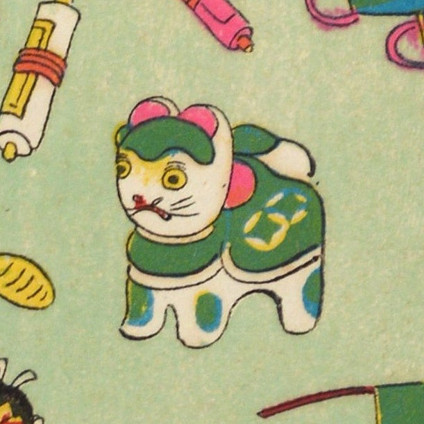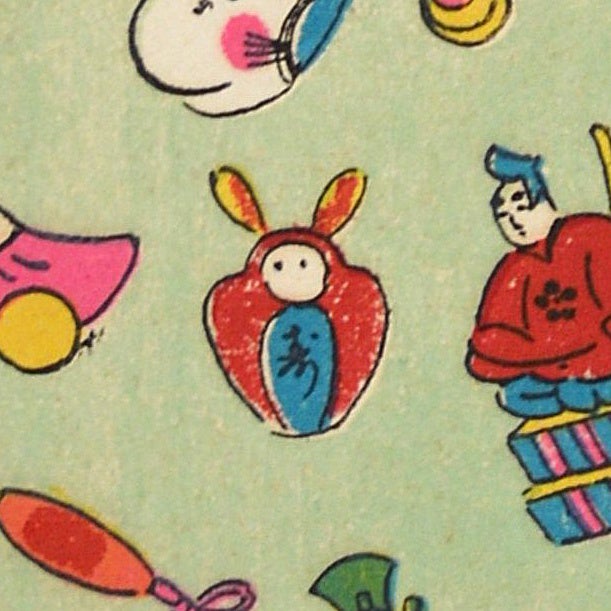 画面いっぱいにさまざまな玩具が描かれた尽くし絵となっています。犬張子やみみずく人形は東京近郊で作られた玩具ですが、当時すでに全国的に知られるものであったことが想像されます。よく見ると、近代の作らしく自動車のおもちゃも描かれ、新旧さまざまな玩具を目で楽しむことができます。本紙の左上には兎のマークが刷られており、大正9年(1920)創業の京都の木版印刷物販売店・岡本ピョンピョン堂(現:ぴょんぴょん堂)の千代紙だと思われます。