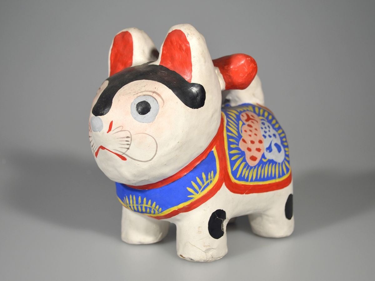 犬張子は東京を代表する郷土玩具で、丸いフォルムと体に描かれた花模様がその特徴です。犬はお産が軽く子の成育がよいというところから、子どもの健康や幸福を願い犬張子が授けられました。古くは平安時代から、子どもの枕元に犬筥(いぬばこ)(犬の姿をかたどった張子細工の箱)を置く習わしがありました。その後、いつから張子人形が作られるようになったかは定かでないものの、安永3年(1774)刊行の玩具絵本である『江都二色(えどにしき)』にはすでに犬張子の絵がみえます。