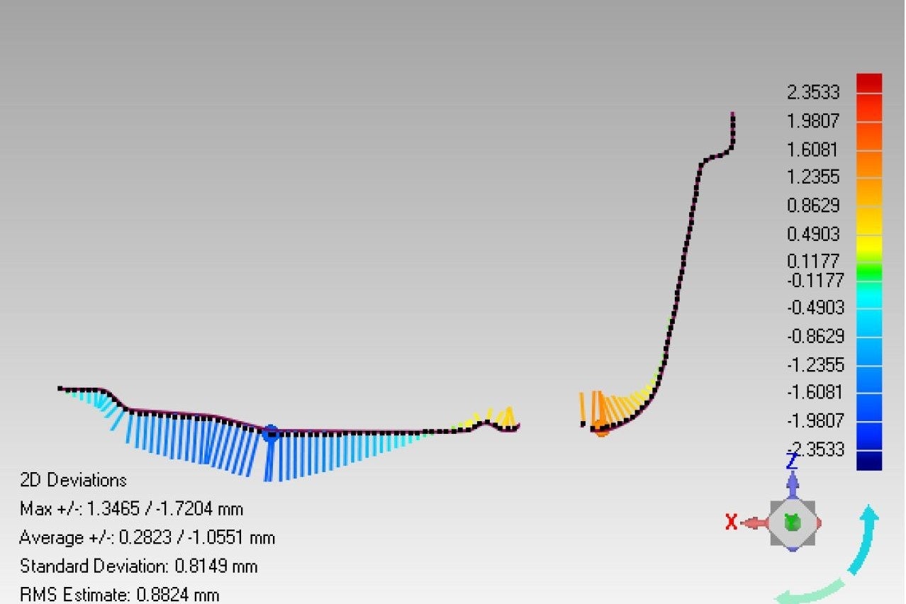 「偏差補正」機能により、製造工程で発生する材料の収縮や膨張に対し、3D比較結果を基にポリゴンを自動で調整します。これにより、実物により忠実な3Dモデルを作成でき、精密な設計プロセスが支援されます。