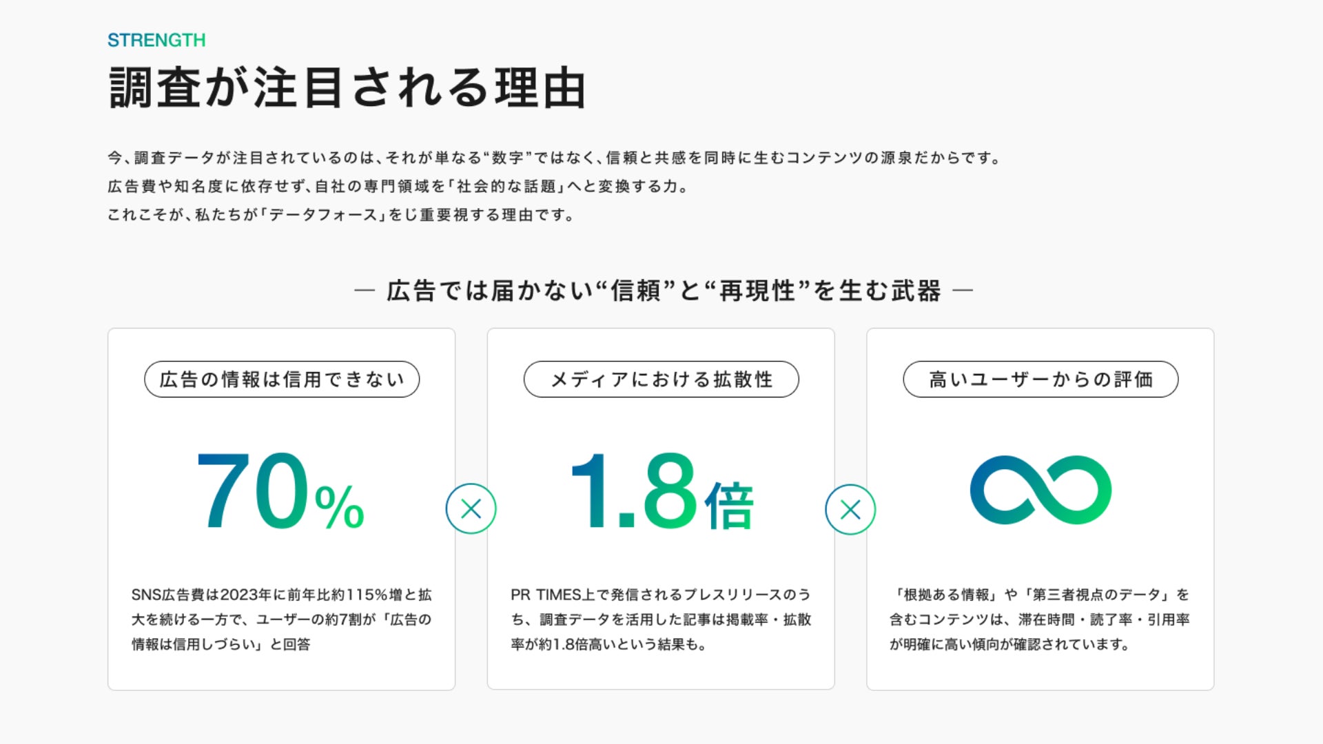 「データを武器にする企業」としての姿勢を体現するため、Webサイト上にも実際の調査データから明らかになったファクトを配置しました。