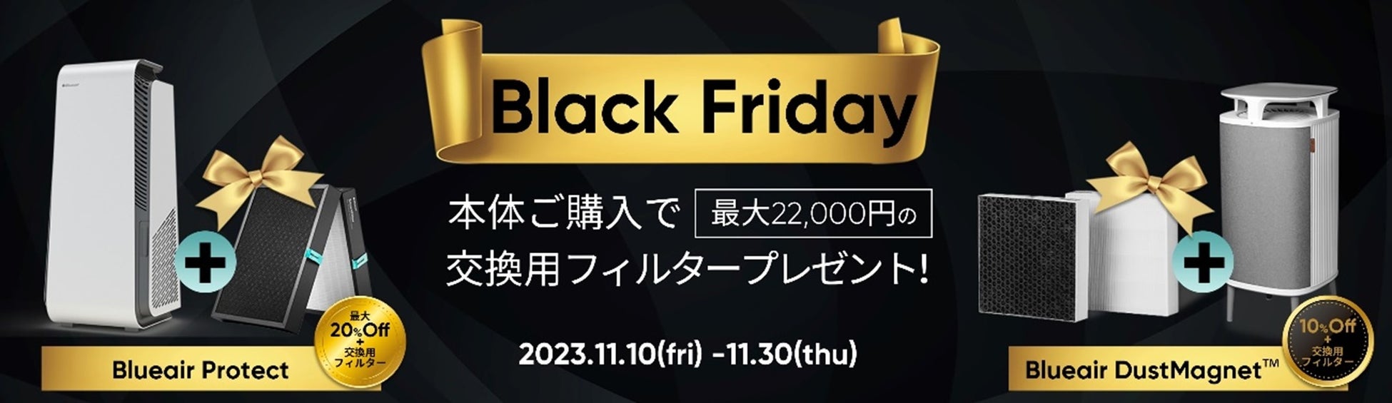 感染症が気になるこの時期、ブルーエア公式オンラインストアでは本日よりブラックフライデーを開催。ブルーエアのフラッグシップモデル「Blueair Protect」及び「Blueair DustMagnet™」が最大20%OFF+交換用フィルターもプレゼント!お得なこの機会をお見逃しなく。