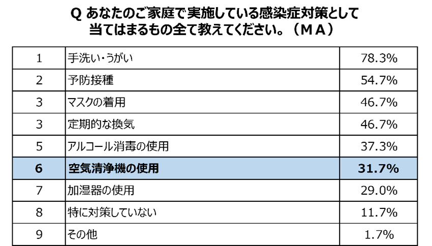 調査では、一年のうちで感染症対策を実施している時期は、「一年中」が42.7%と1位で、次に「冬」が22.3%の2位という結果となった。年間を通して、感染症への対策を行っている人が多く、感染意識が高まっていることが分かった。具体的な感染症の対策方法としては、「手洗い・うがい(78.3%)」が1位、2位以降でも、「予防接種(54.7%)」「マスクの着用(46.7%)」「定期的な換気(46.7%)」となり、基本的な予防対策が上位だった。家庭内のウイルス除去として有効な「空気清浄機の使用(31.7%)」は6位という結果で、基本的な感染対策と並行して、空気清浄機の使用はまだ少ない印象。