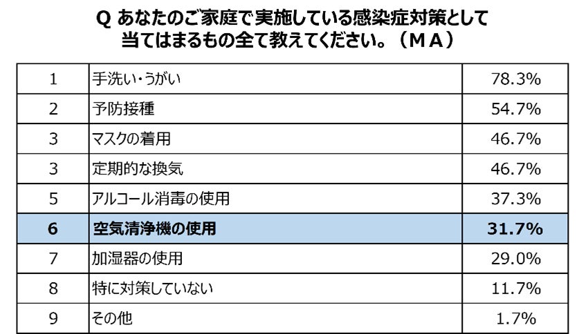 具体的な対策方法1位は「手洗い・うがい」、続いて「予防接種」「マスクの着用」「定期的な換気」を行っているものの、「空気清浄機の使用」は31.7%に留まる。