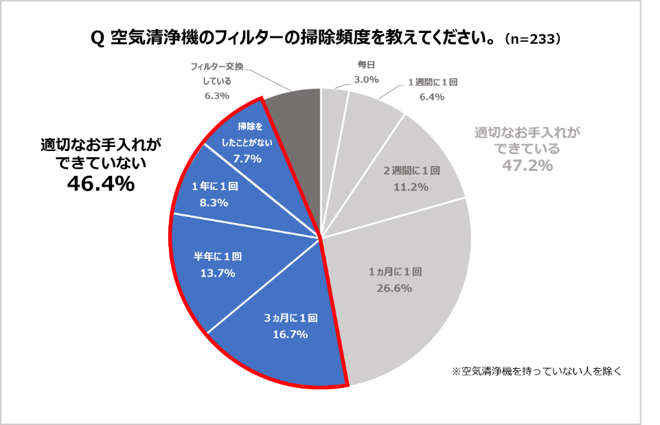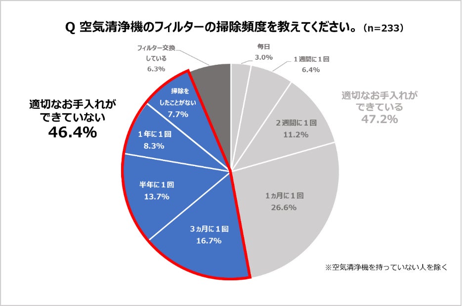 ・ 空気清浄機を使っている家庭のうち、約半数の46.4%が適切なタイミングでお手入れできていない。