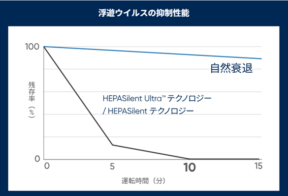 *5:【試験機関】Guangdong Detection Center of Microbiology【対象】1種類のウイルス【試験方法】試験室(30 ㎥)において1種類のウイルスを含んだ懸濁液を噴霧し、Blueair Protect 7710iを運転させウイルスをフィルターに捕集させた。試験機の GermShield™ モードを ON にして温湿度チャンバー(10 ㎥)の中で24 時間運転後、フィルターからウイルスを採取した。【試験結果】24時間で99.8%抑制 (2020FM24061R01E) 密閉した試験空間での効果であり、実使用空間での実証結果ではありません。