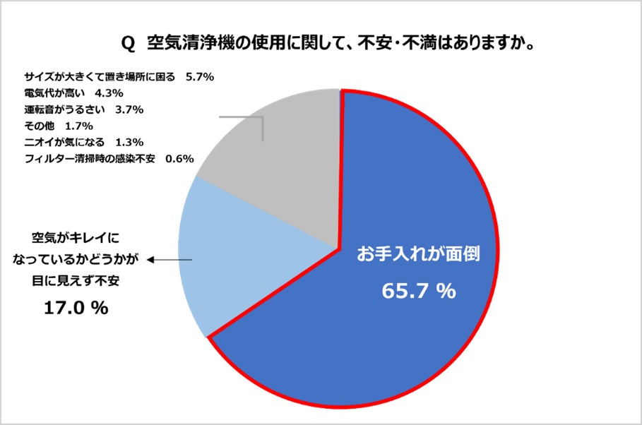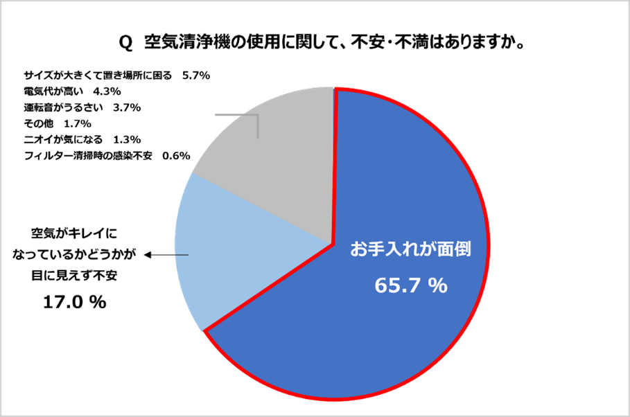 ・空気清浄機の使用に関しての不安・不満の1位は「お手入れが面倒(65.7%)」、2位は「空気がキレイになっているかどうかが目に見えず不安(17.0%)」という結果に。