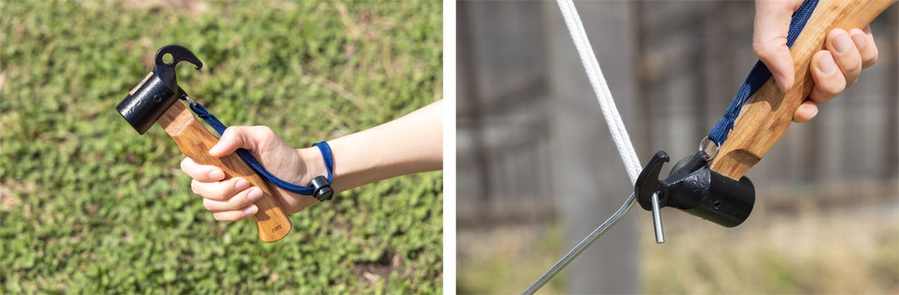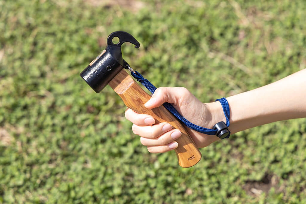 キャンプ初心者に向けたおすすめギアやお役立ち情報をYouTubeで発信するキャンプ歴約14年の「FUKU」が考案した、オリジナルのペグハンマー。荷物が多くなりがちなキャンプではギアの軽量化が重要ですが、このペグハンマーは「軽量・コンパクトかつ、実用的であること」を追求して作られました。軽量なペグハンマーだと固い地面には打ちづらいこともあるのですが、FUKUオリジナルの「ソロハンマー.S」は、従来のコンパクトサイズのペグハンマーと比べて「しっかり打ち込める」という点が特徴です。