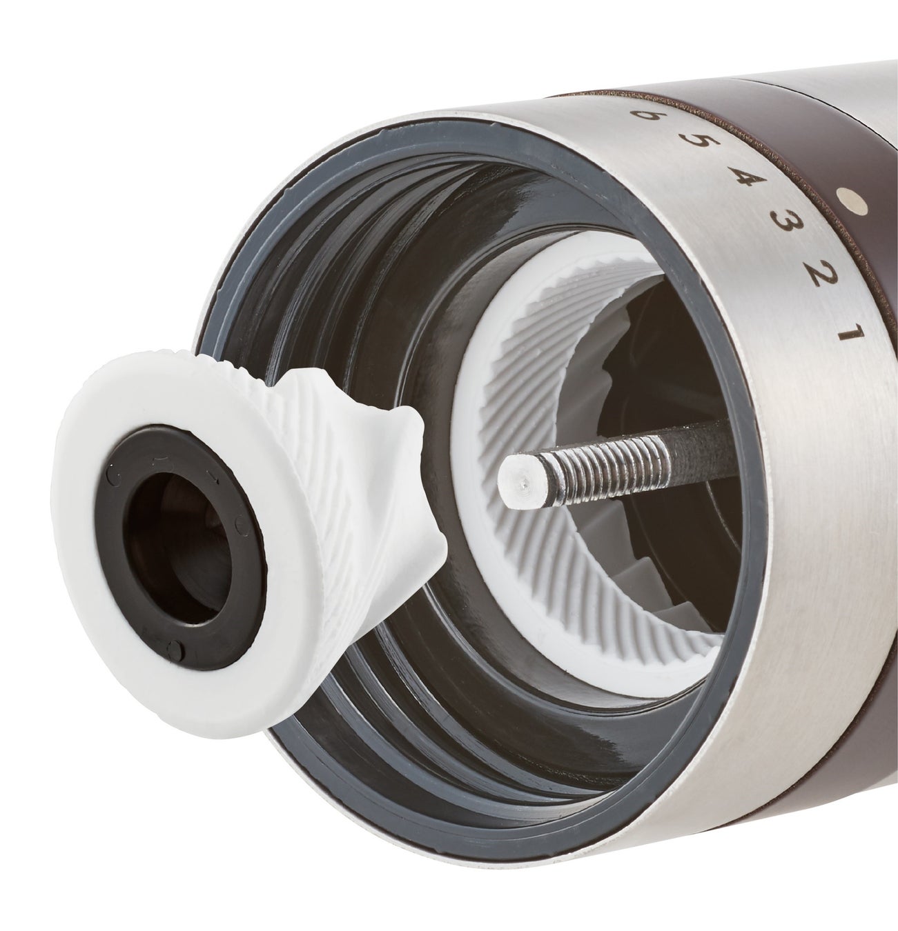 本製品は、自分好みの挽き具合を選べる手動タイプのコーヒーミルです。コーヒー豆の粒度(挽き具合)は細挽きから粗挽きまで6段階から、自分好みに調節することができます。セラミック製の臼を使用することで、摩擦熱が発生しにくく豆本来の味と香りが楽しめます。ハンドルが取り外せて持ち運びや収納がしやすいのも便利なポイント。スリムでコンパクトなので、キャンプやピクニックなどのアウトドアにも適しています。ホッパー(豆を入れるところ)にはちょうどカップ1杯分の豆が、ガラスボトルには2杯分の挽いた豆が入ります。お家でもアウトドアでも映えるスタイリッシュなデザインで、いつでもどこでも、コーヒー豆を自分の手で挽く贅沢な時間と、挽き立ての香り高い一杯をお楽しみいただけます。