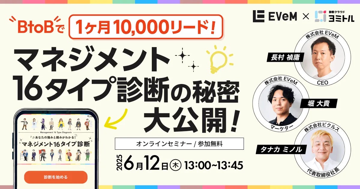 EVeMと診断クラウド「ヨミトル」を提供する株式会社ピクルスは、「マネジメント16タイプ診断」に関する特別共催ウェビナーを2025年6月12日に開催します。