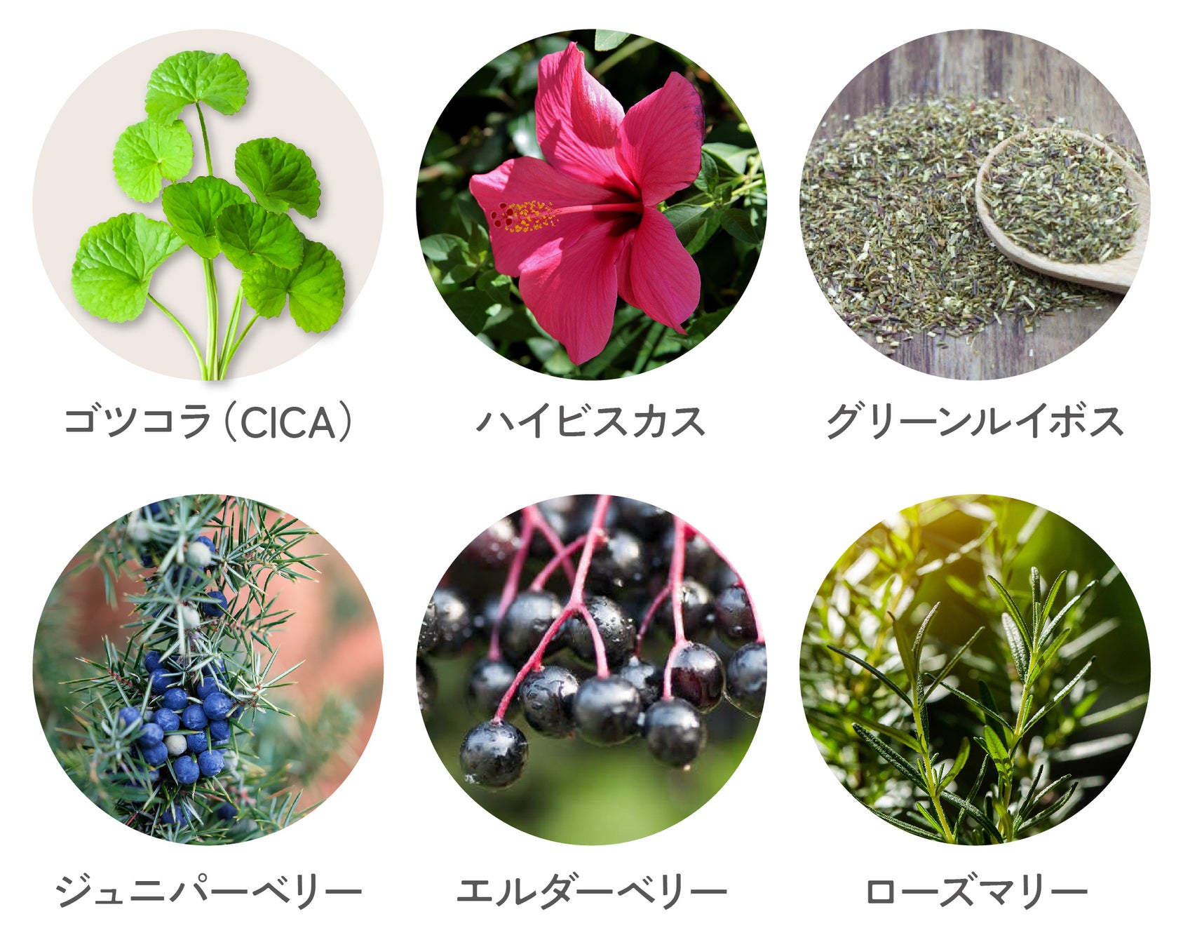 CICA(ゴツコラ)に加え、美容や健康を意識する方に嬉しいハーブを厳選配合しました。ビタミンCが豊富できれいな赤色が特徴のハイビスカスや、爽やかな香りでリフレッシュしたい時にもぴったりのジュニパーベリー、エルダーベリー、ローズマリーなどをブレンド。