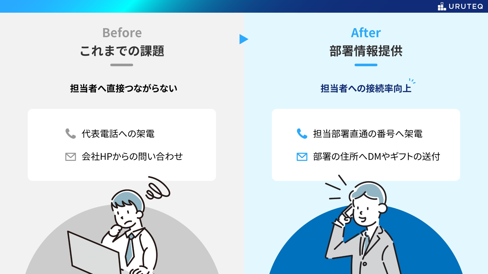 これまでウルテクを活用した支援の中で購買意欲が高い企業を検知できましたが、部署情報が不足していたため、代表電話を通じた架電や会社HPからの問い合わせが主なアプローチ方法となり、担当者への接続率を上げることが課題として挙がっていました。しかし、ウルテクに部署名や直通電話番号等の部署情報を追加することで、ターゲット企業の担当者に接続しやすくなり商談獲得率の向上が可能になります。
